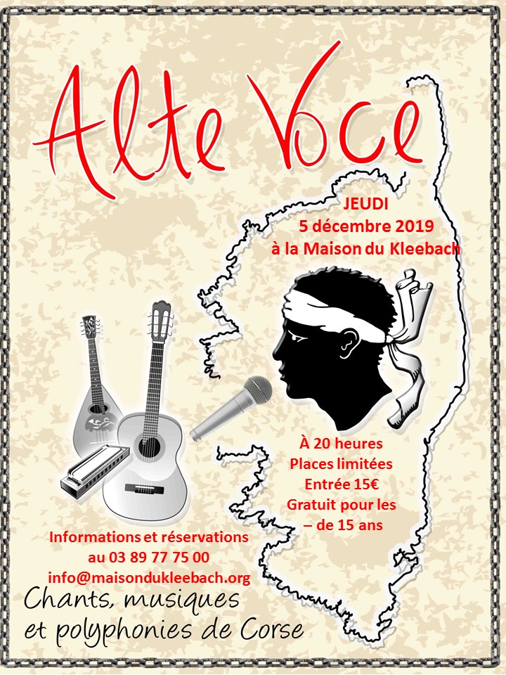 L’ensemble Alte voce s’arrêtera en vallée de Munster le Jeudi 5 décembre à 20h00 sous la direction de Jean Mattei, l'âme du groupe qui voue une passion viscérale à l'île de Beauté. Il est un ardent défenseur de son identité et de sa langue et tout au long de la soirée, il se fera l’ambassadeur de sa province... Chants et musiques s'harmonisent parfaitement, trémolos dans les voix et dans les cordes, des idées et des valeurs chères au peuple corse sont véhiculées… les musiciens de l’ensemble proposeront un florilège de chansons ayant trait à l’amour, l’enfance, la famille, les fêtes, l’histoire et bien sûr les us et les coutumes corses le tout accompagné à la guitare, à l’harmonica et à la mandoline... de belles séquences de polyphonies en perspectives, le tout dans un décor idyllique.